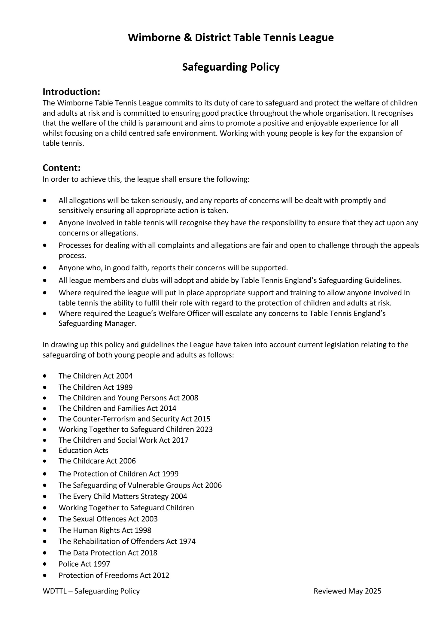 Anti-bullying policy for the Wimborne & District Table Tennis League